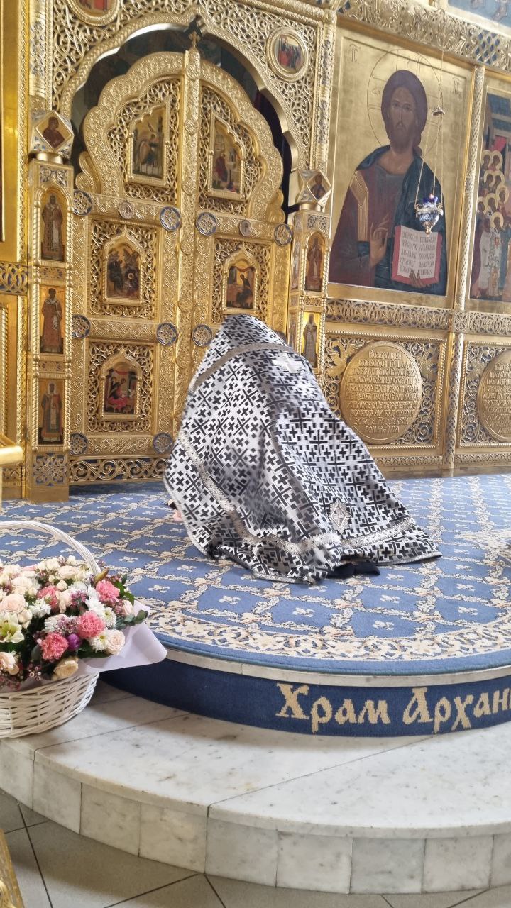 настоятель храма или монастыря по окончании вечерни с земным поклоном